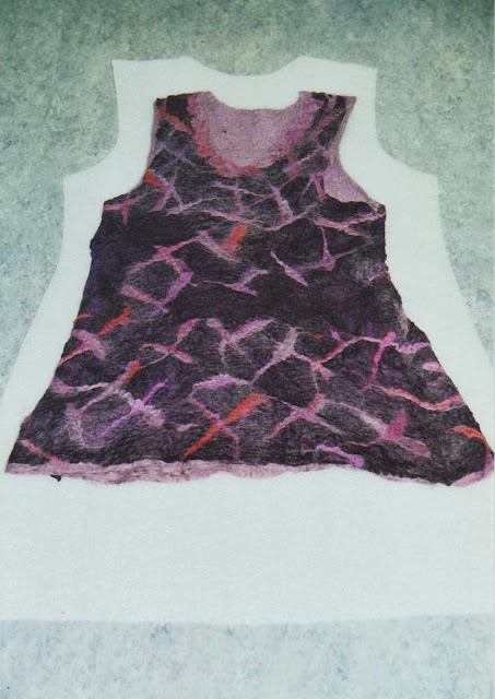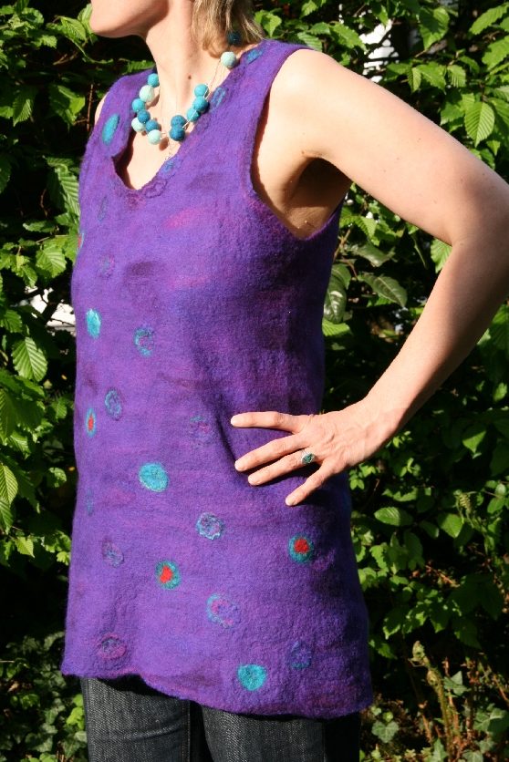 - Nun den Gardinenstoff umschlagen und die Tunika umdrehen. Rückenmuster auflegen und Gardinenstoff wieder auf das Werkstück legen. Mit heißer Seifenlauge befeuchten. Ich benutze dazu eine Gießkanne. Dann das ganze Werkstück mit Schwung umwenden und auch die zweite Seite begießen.Das funktioniert natürlich nur mit aufgelegtem Gardinenstoff.